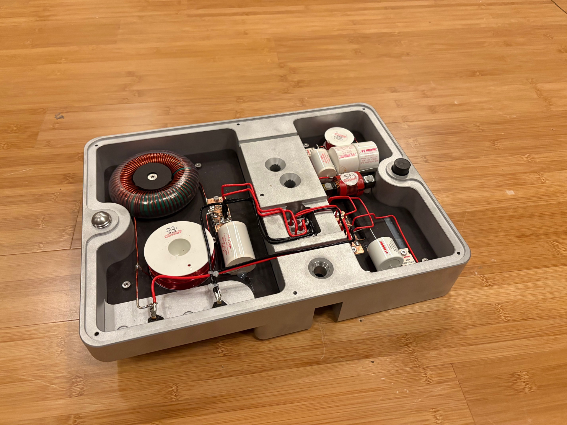 Unpacking is as simple as taking the lids off of the crates, flipping aside the protective fabric and lifting the panels clear of the box. One person at each end will be plenty. Just make sure that you’ve got a carpet or protected surface on which to stand the panel, on its long edge. Each panel is supported by a solid, cylindrical aluminium foot under the outer end, a large block under the inner end, beneath the mid and treble drivers. This weighty block is also machined from solid aluminium, pocketed on the underside to accept the crossover components. It is electrically connected to the drivers by a small, upward facing terminal block, with seven substantial gold-plated contact pins and three, even larger locating rods. Mechanically, it’s help in place by three large allen bolts that screw vertically though the foot and into the base of the panel – hence the need to place the panel on edge for assembly. With the foot attached, you simply have to stand the speaker up and place it. The finished structure is remarkably stable, given its vestigial profile, but the combination of its weight and painted finish makes it tricky to get a decent grip on. If you need to move the speaker much more than a foot, either slip a skate under the raised central portion (making sure that it can’t flip sideways on you) or use lifting straps. Either way, it’s a two-man operation.