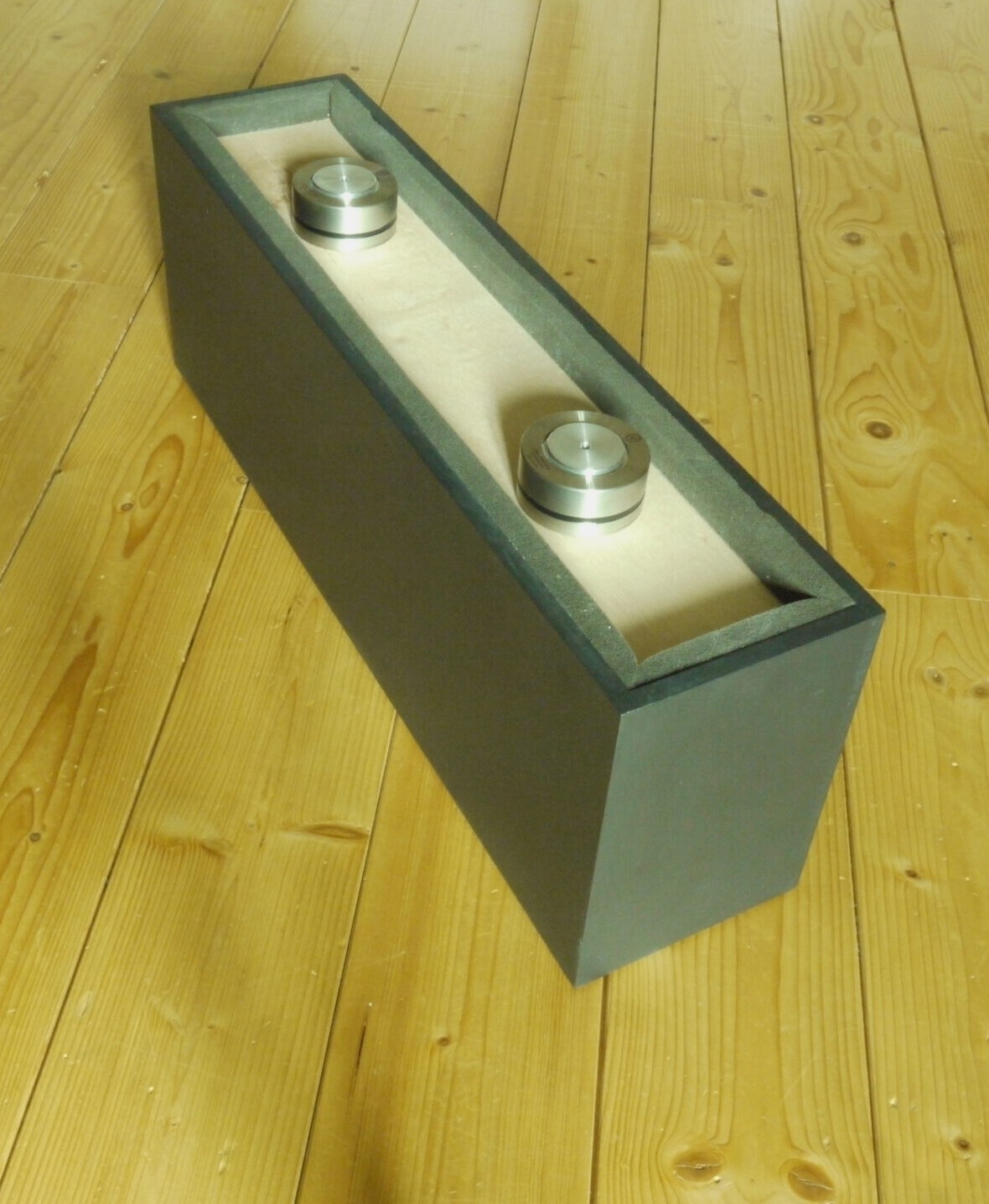 What I’ve described above is the simplest possible (and cheapest possible) structure. Its one serious shortcoming is a lack of a levelling facility. You can tinker with the top platform and the sand beneath it, but that’s only ever going to be an approximate and pretty hit or miss solution. You could fit levelling feet to the underside of the carcass, but to achieve a really effective result mandates a far thicker base to accommodate the necessary threaded inserts. Bear in mind that the finished article is going to be pretty heavy, so wimpy little M6 or 3/32 threads just ain’t going to cut it – at least, not long term. Generally, where levelling is critical, I will either use a coupler with a levelling capability between the top platform and the unit that’s sitting on it, or the simple expedient of card shims under the felt pads. Somehow, the latter seems more in keeping with the general DIY ethos. If the idea offends you, you can always trim them to match the felt footers precisely.