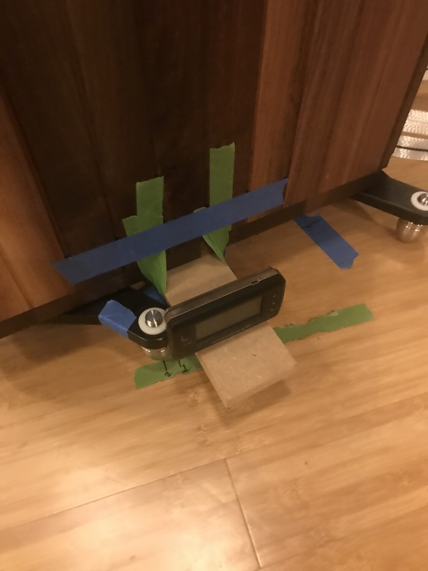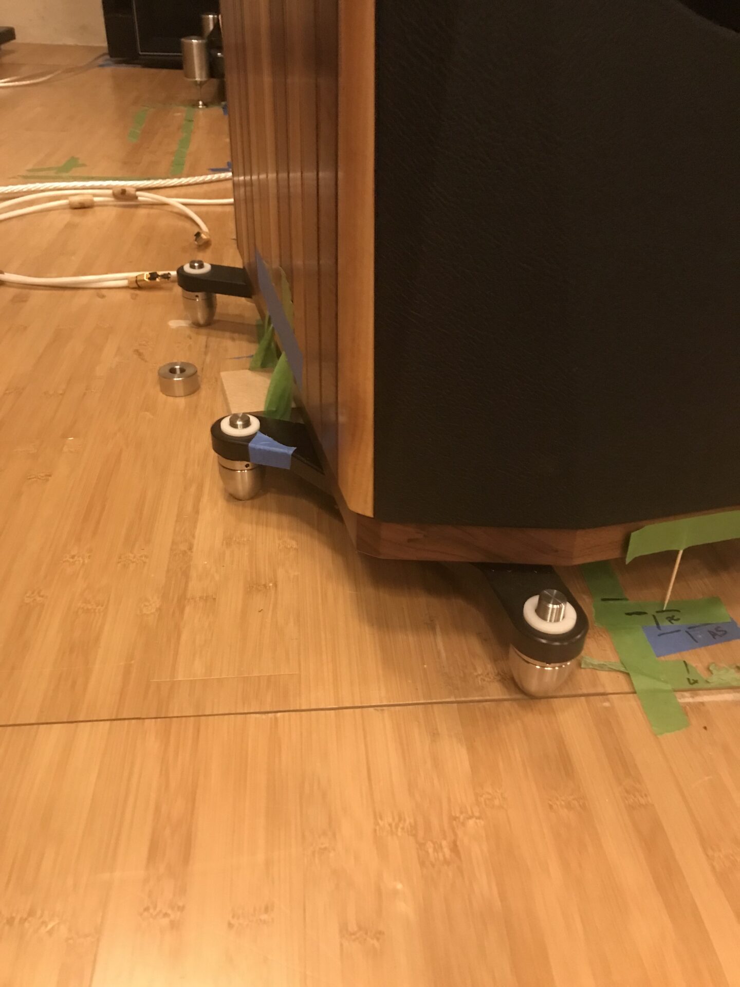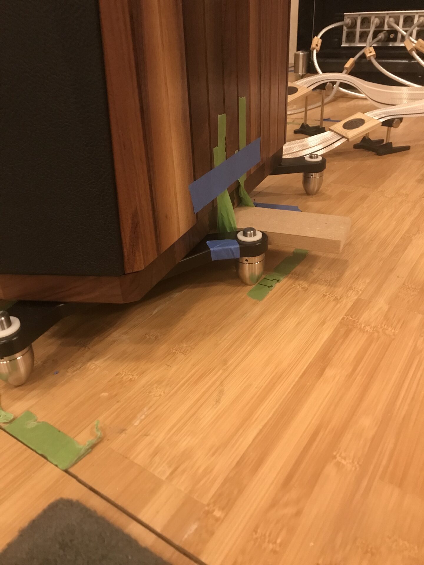 With the speakers in their initial placement, optimized for distance to front and side-walls, it’s time to get serious about height and orientation. Which brings us to the second major challenge: try finding a reference for angular attitude on this speaker! Just getting it level is difficult enough – for two reasons: it has zero horizontal surfaces (except the base and that sits so close to the floor that you can’t get most levels underneath it); it is clad in strips of wood, which means that getting any sort of consistent reading off any surface is almost impossible. Even standing a narrow metal strip across the outriggers and sitting the level on that proved way too variable, due to flexibility in the outriggers themselves. Inherited from the smaller speakers, these need to be beefed up significantly, which fortunately, is both easy to do and already in hand. However, that doesn’t help solve the problem of finding a reference level. The solution? Taping a narrow MDF board across the bottom of the speaker. Is it absolutely level? No. But is it stable and consistent – ie. a reference? Absolutely. As an indicator of relative movement it’s fine – but you are still going to have to figure out how to zero out the speaker to start with. I used some extremely small digital levels that are not my most accurate, but do at least get under the speaker to take a read off of the base-board. The difference between the base and the MDF platform is consistent, at 0.1 degrees front to back and 0.2 degrees laterally, but as I said, as an indicator of relative angular change, that’s fine.