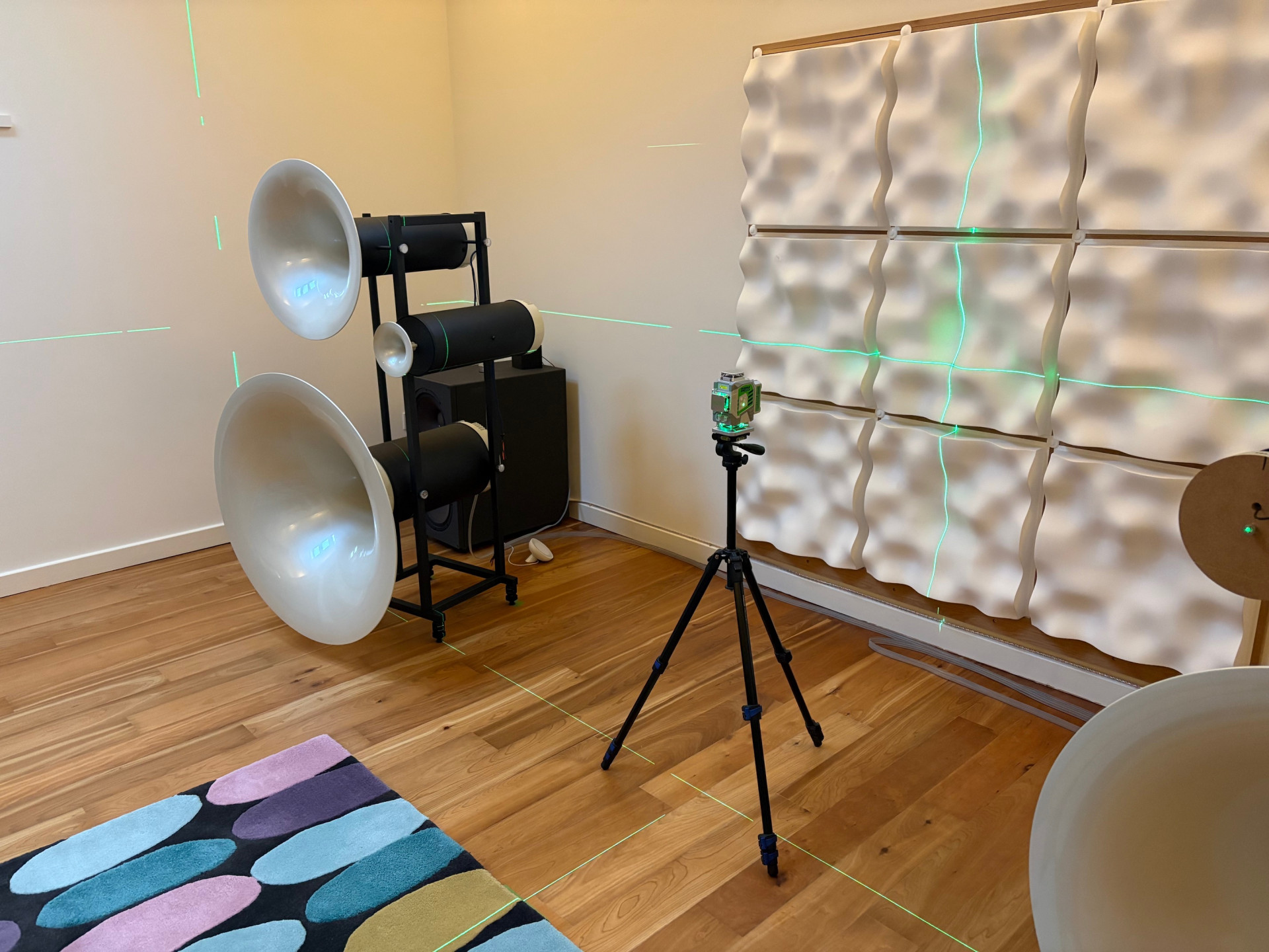 By using the 4×360 laser, you can throw a line that sets a perpendicular to the plane of the speakers. Centre that perpendicular on the listening position and that will give you the centre point between the speakers. Measure from the placed speaker to the centre and then place the other speaker the same distance the opposite it along the speaker plane. Always choose a specific point on the speakers: the inside front spike is a good option, or you can provide a laser target by placing a precisely measured mark on a piece of tape at an appropriate point on the edge of the speaker. One advantage of using the spike is that it will also likely be the point about which you rotate the speaker to adjust toe-in. Alternatively (and with wide-bandwidth speakers) you can fix the centre line of the speaker by attaching a cocktail stick at that point. In this particular case, the inner spike approach worked fine as the Trio ‘satellites’ only extend down to 100Hz, so listening axis of the horn drivers is more important than their placement relative to room nodes/bass performance – which is handled by the subs and is a whole different story.