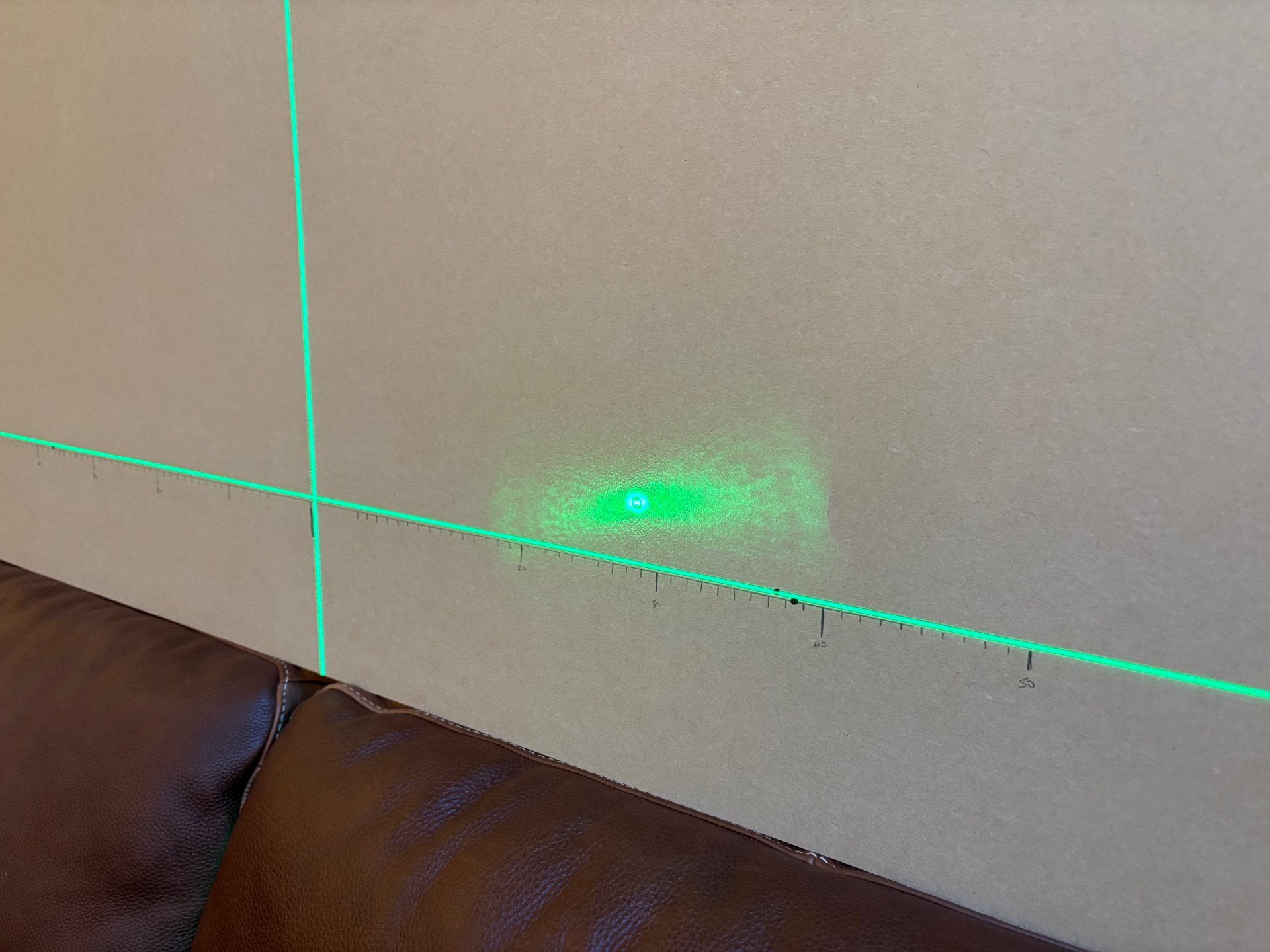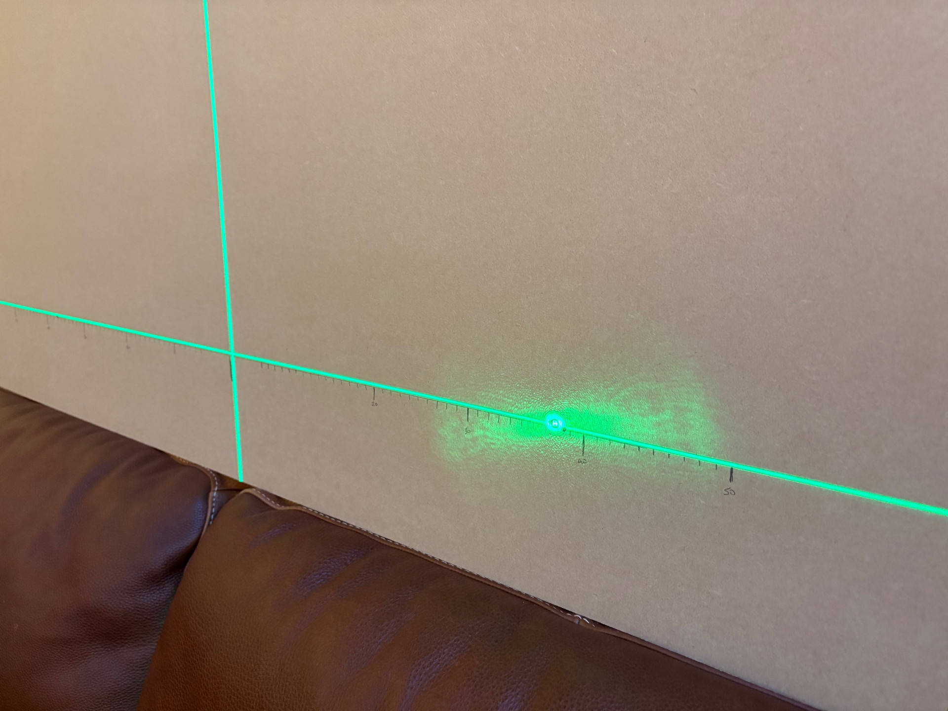 With the bore-sight laser mounted over the tweeter you can display rake angle with considerable precision, but to do so you need a target. It can be as simple as a strip of tape (or even a tape measure) with graduations marked across it, stuck to the back of the listening seat. But it’s better to set a graduated lateral line at seated ear height. For that you’ll need a piece of board or card, supported vertically on the listening seat. Use the 4×360 laser to set a horizontal line across it and then mark and graduate that line about the centre point. Using the bore-sight laser and the speaker’s feet/spikes, you can now bring the tweeter axis to ear height and establish its toe-in/out. It’s then easy to set the other speaker to match.