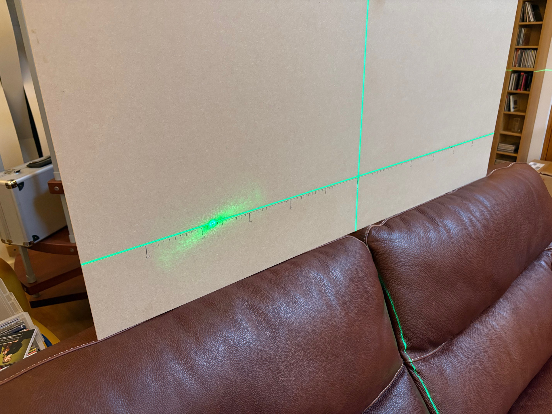 With the bore-sight laser mounted over the tweeter you can display rake angle with considerable precision, but to do so you need a target. It can be as simple as a strip of tape (or even a tape measure) with graduations marked across it, stuck to the back of the listening seat. But it’s better to set a graduated lateral line at seated ear height. For that you’ll need a piece of board or card, supported vertically on the listening seat. Use the 4×360 laser to set a horizontal line across it and then mark and graduate that line about the centre point. Using the bore-sight laser and the speaker’s feet/spikes, you can now bring the tweeter axis to ear height and establish its toe-in/out. It’s then easy to set the other speaker to match.