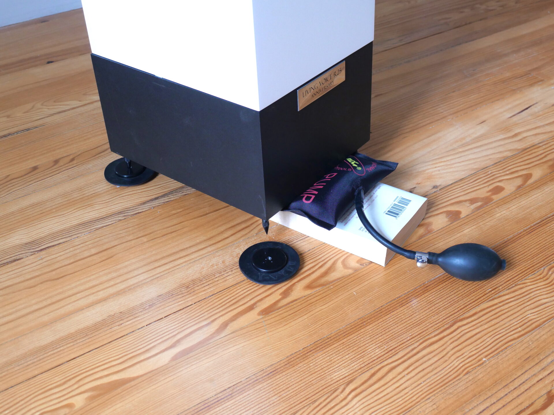 One viable and more affordable alternative, particularly with lighter speakers (something the size of the Wilson Sasha for instance) is an Air Wedge. Available in different sizes and shapes from a multitude of suppliers, you may need to get inventive with books to lift the bladder to the ideal height. The end result is much the same as the mechanical jack, just not quite as stable, which is what limits their use with really heavy or tall speakers.