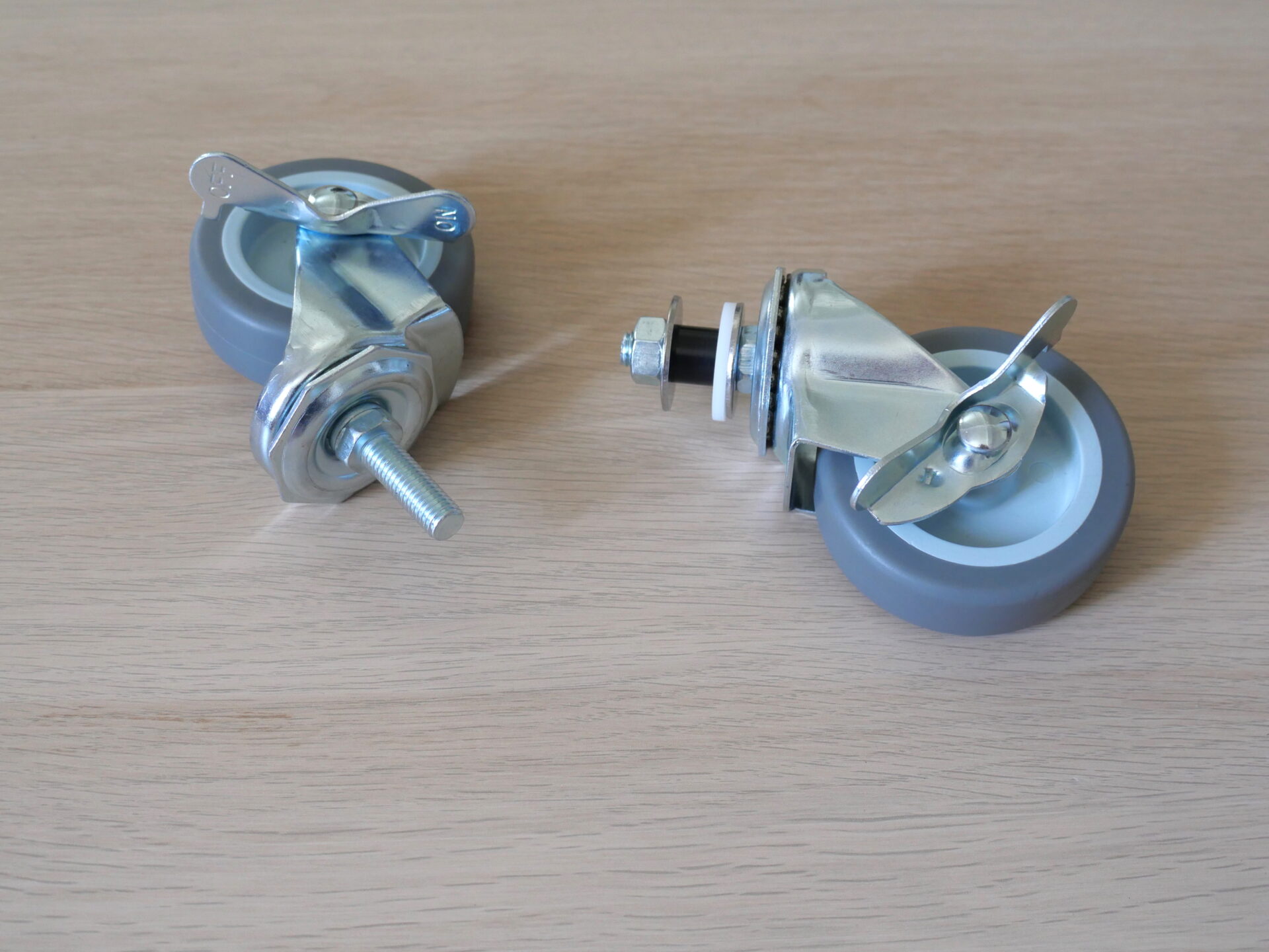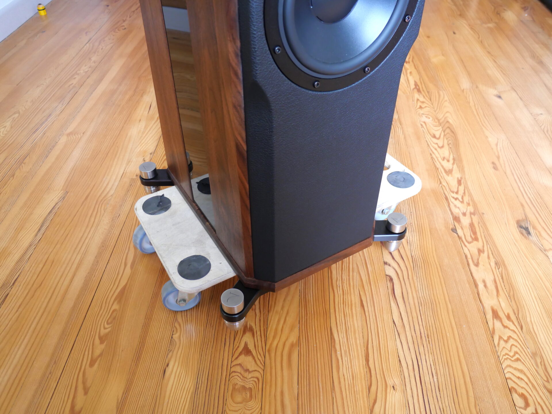 If your speaker has a standard thread size – like M8 or M10 for instance – you should have no trouble finding stock casters that will fit directly. Just make sure that the threaded posts are not too long or they won’t go in all the way and will likely bend as soon as the caster meets any kind of obstruction. I have sets of both M8 and M10, both with softly shod 70mm wheels that roll easily irrespective of the weight being carried. They have axle locks to render the speaker immobile, although the lever/friction locks you also see are just as effective. But the really important thing is that they are rated for 280kg per set of four, making them useable with any speaker I’m prepared to tackle on my own. Just don’t be tempted to skimp on the quality of the casters you purchase: Casters that collapse under the weight of your speakers are not just useless, they are potentially dangerous! Always buy casters that are load rated and don’t just assume that because they supported your last set of speakers they’ll with the new (inevitably bigger) ones…