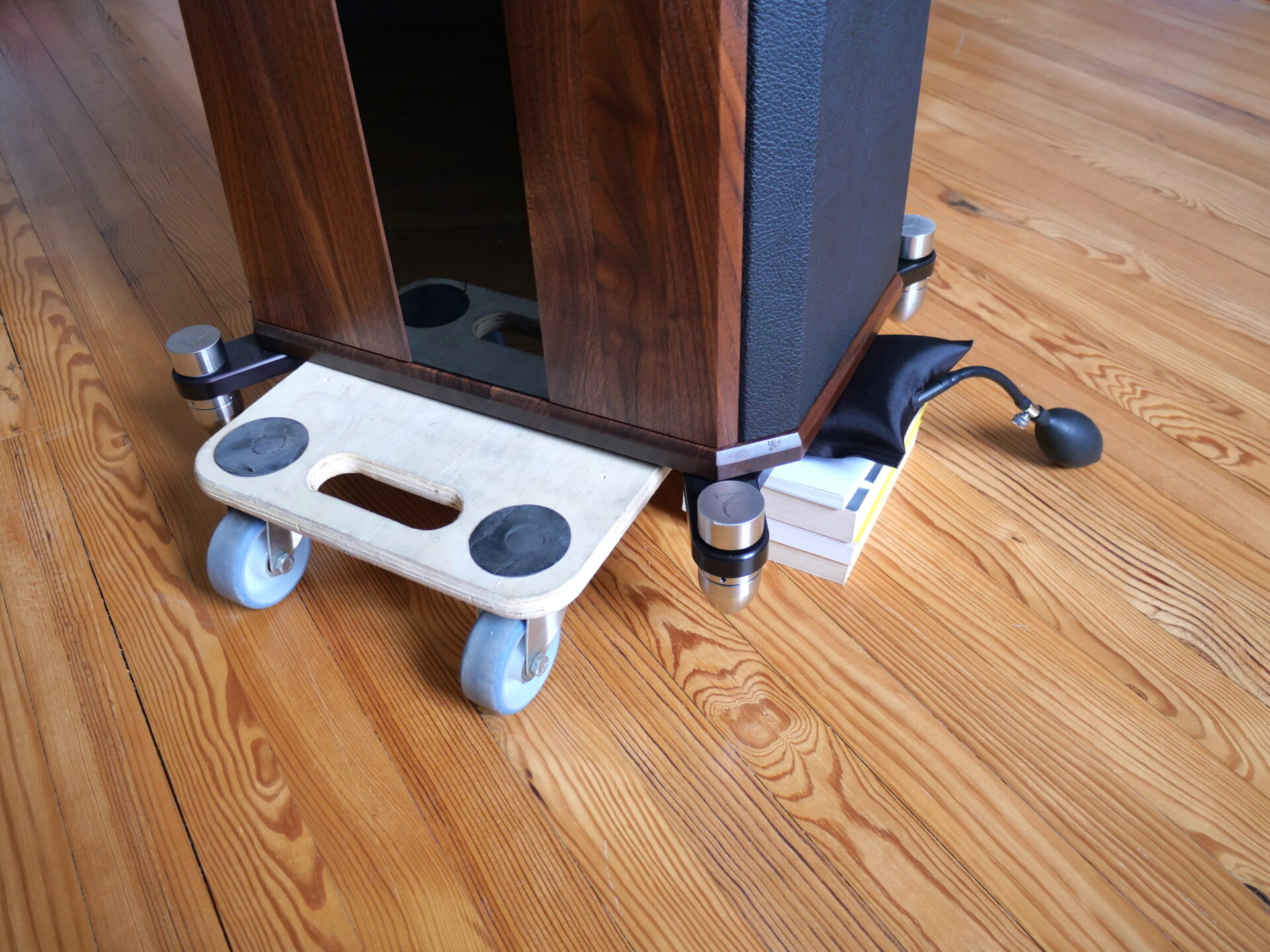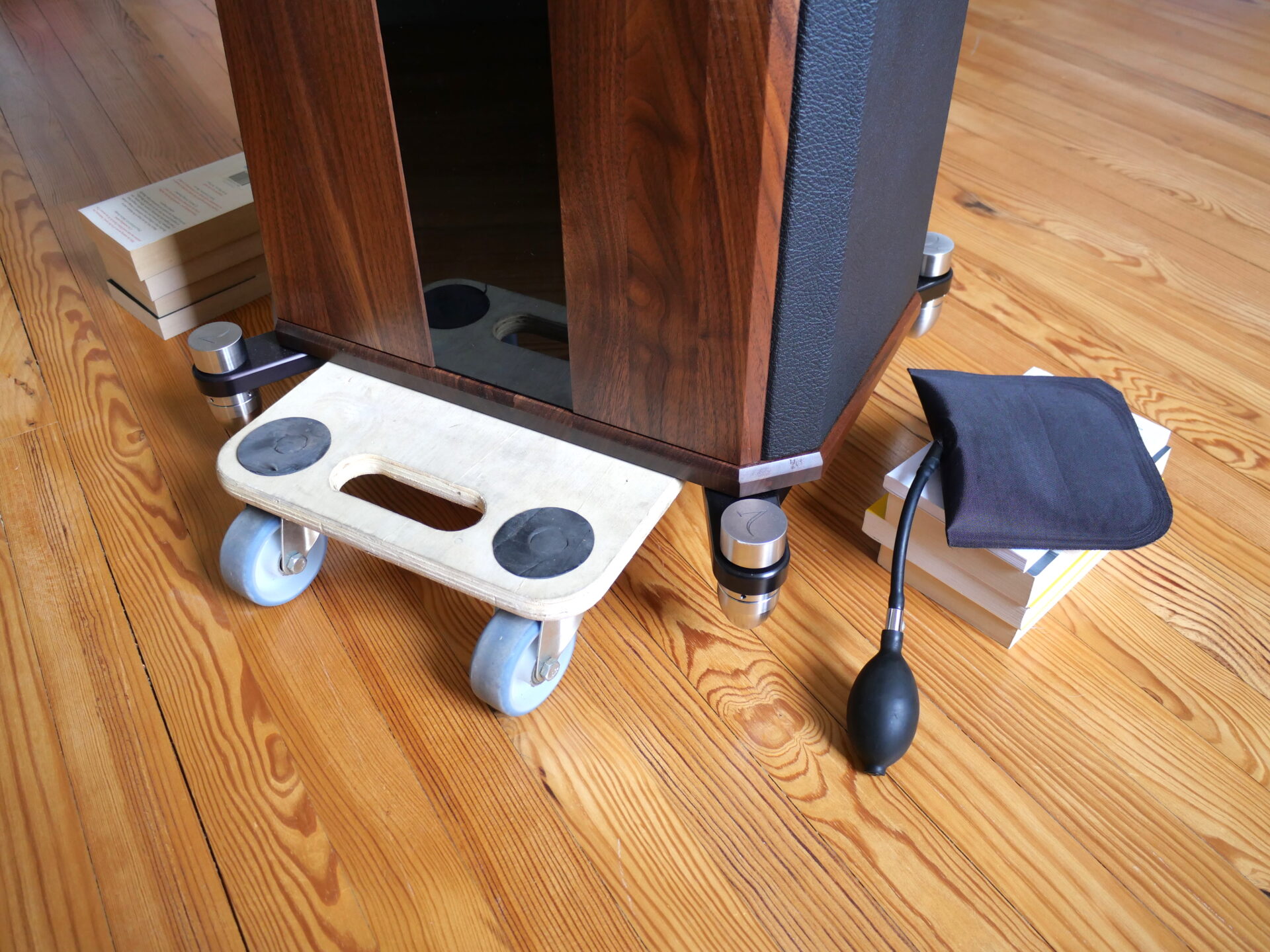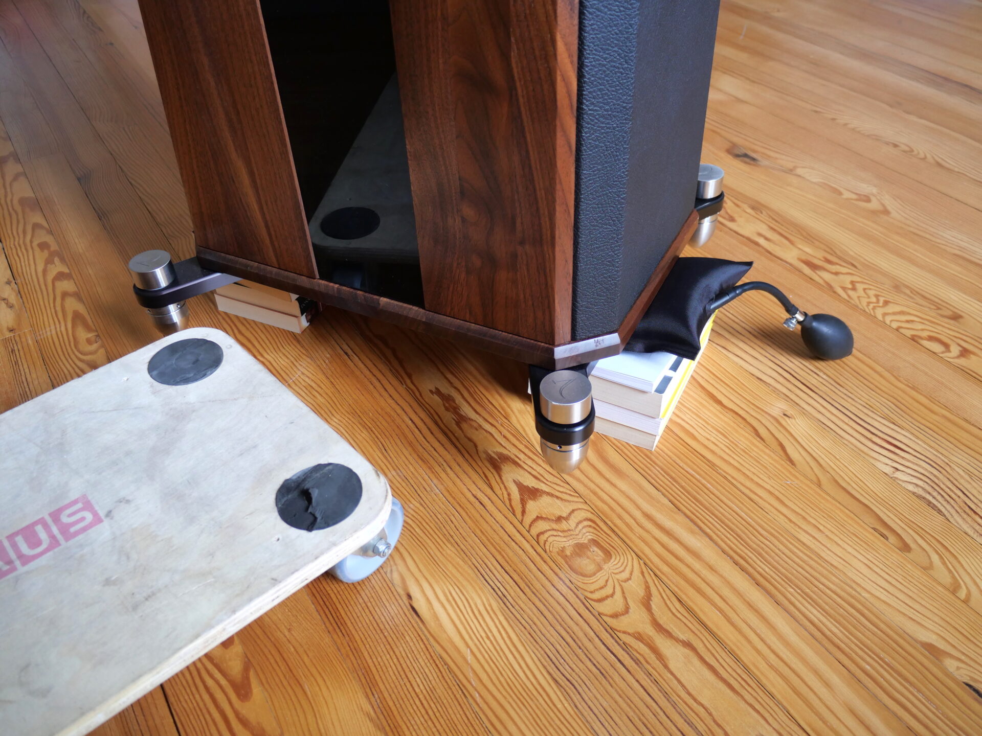 Inflate the bladder just enough to slip the skate under the middle and then lower the speaker onto it. That means selecting the size, shape and the top surface of the skate you are going to use, to make sure that you can get the speaker on and off in a stable fashion. This works well on speakers the size and shape of the Stenheim A5 or the Wilson Sasha and has the benefit of leaving the spikes in situ and their adjustment intact.