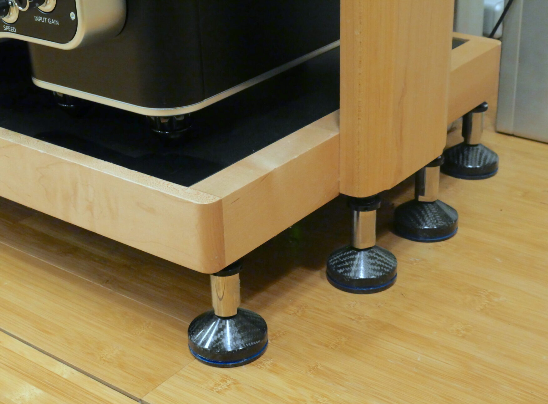 Why wait until now to swap out the existing rack, if I’m already using a Grand Prix rack under the ‘table? Because it’s not just the system that has changed and evolved. The new Monza rack offers a number of important advantages over the previous (and still current) Monaco Classic, not the least of which is price: it’s way cheaper. It is also far more versatile, with adjustable intervals between shelves, more stable in its taller configurations and it’s four-leg format makes it both much more practical and more space efficient – with no third leg sticking way out back. Not only is the Monza extendable, with a far shallower footprint, the absence of that central post, right in the middle of the rear of the shelf can seriously interfere with cable access and dressing. Ohh – and just to cap it off, the Monza sounds better than the Monaco too!