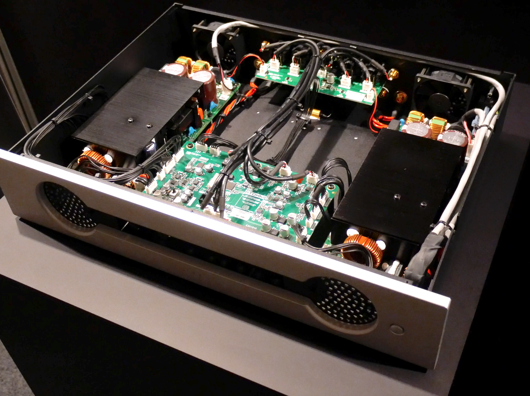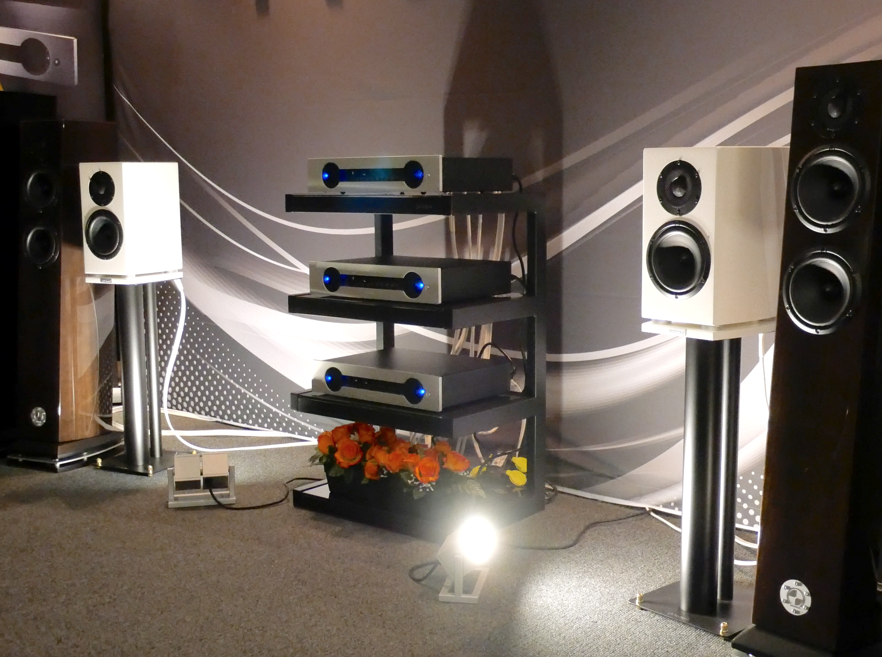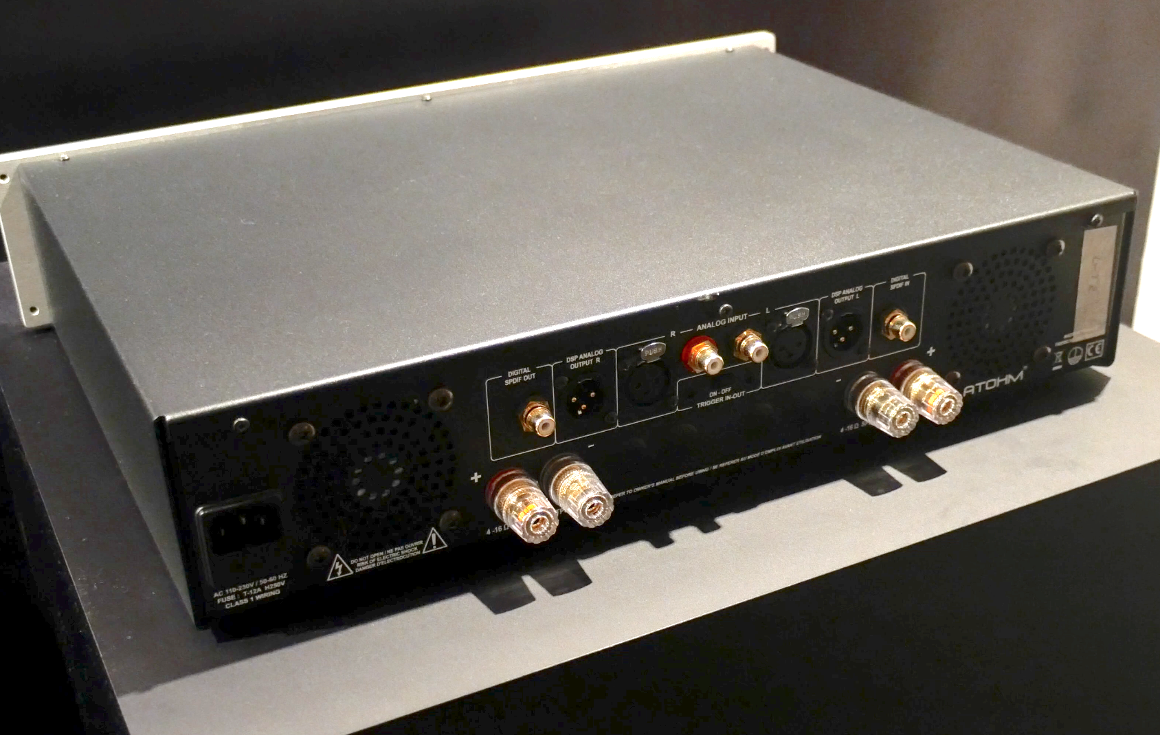 Atohm, manufacturer of an extremely impressive range of surprisingly affordable loudspeakers, showed a fascinating new power amplifier – the RS700 “GT Edition”. Described as a DSP controlled power amp, each standard width chassis contains a high-powered fully differential, fan cooled stereo amplifier (350W/8Ω – 700W/4Ω) and a high-resolution DSP capability. Able to accept analogue (single-ended RCA or balanced XLR) or digital (coaxial S/PDIF) inputs, the amplifier offers four operating modes, one for general applications and three dedicated to the three speaker models in the company’s flagship GT line (hence the three individual amps positioned between the speakers in the show set up). Played via the stand-mounted GT1-HD speakers (€2,700/pr), the sound was refreshingly open, expressive and unconstrained. Dynamics and tonality were natural and scale and extension belied the compact speaker dimensions. This was impressively musical performance, especially at the price: the RS700 amp weighs in at a mere €3,490. That will be music to the ears of anybody whose space is as constrained as their budget, while the performance with the larger GT2-HD and GT3-HD speakers presents a tantalizing prospect. (contact@atohm.com, www.atohm.com)