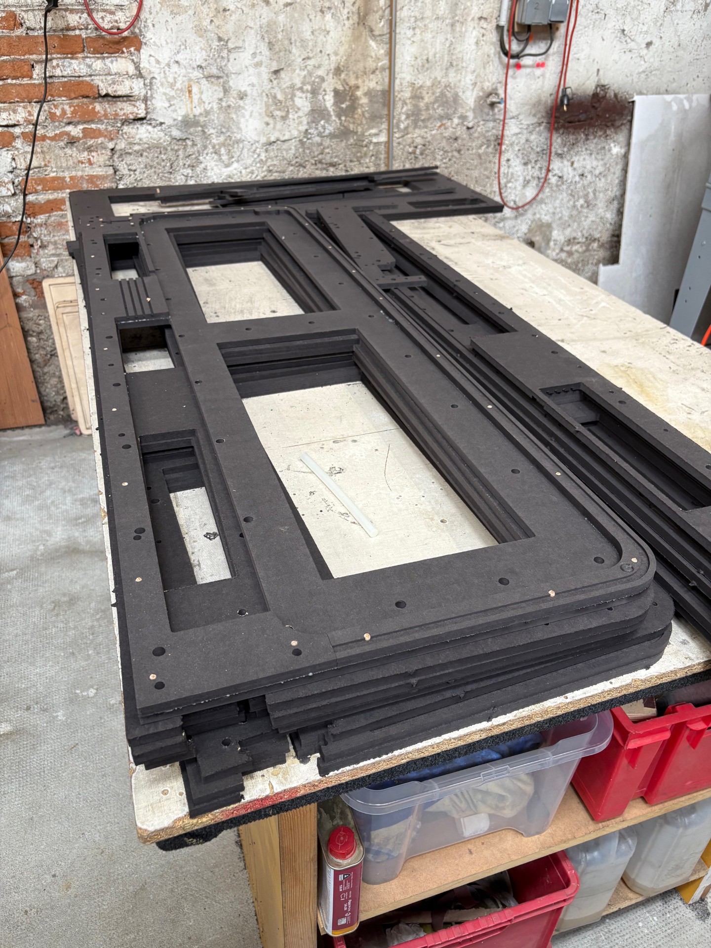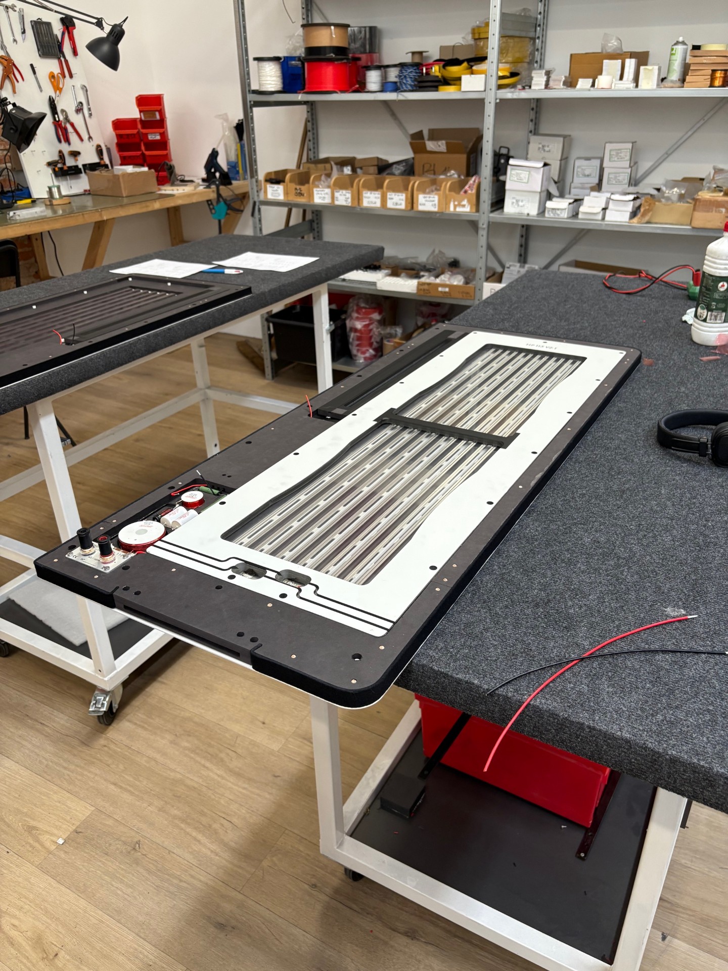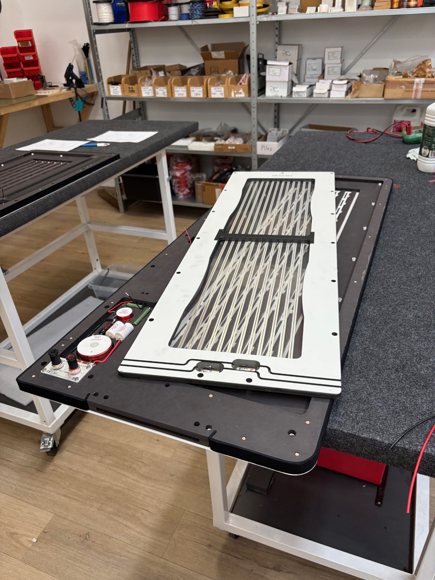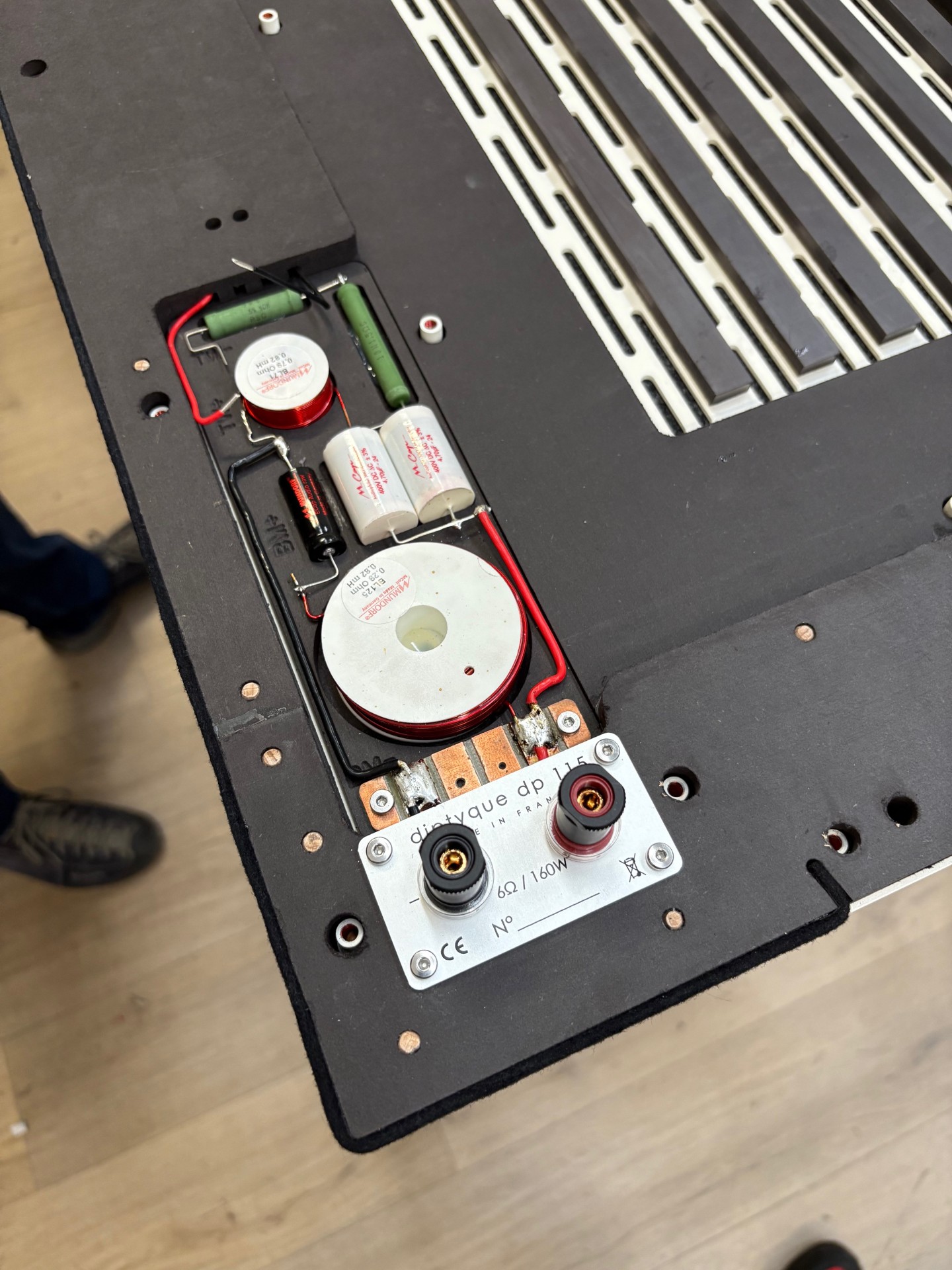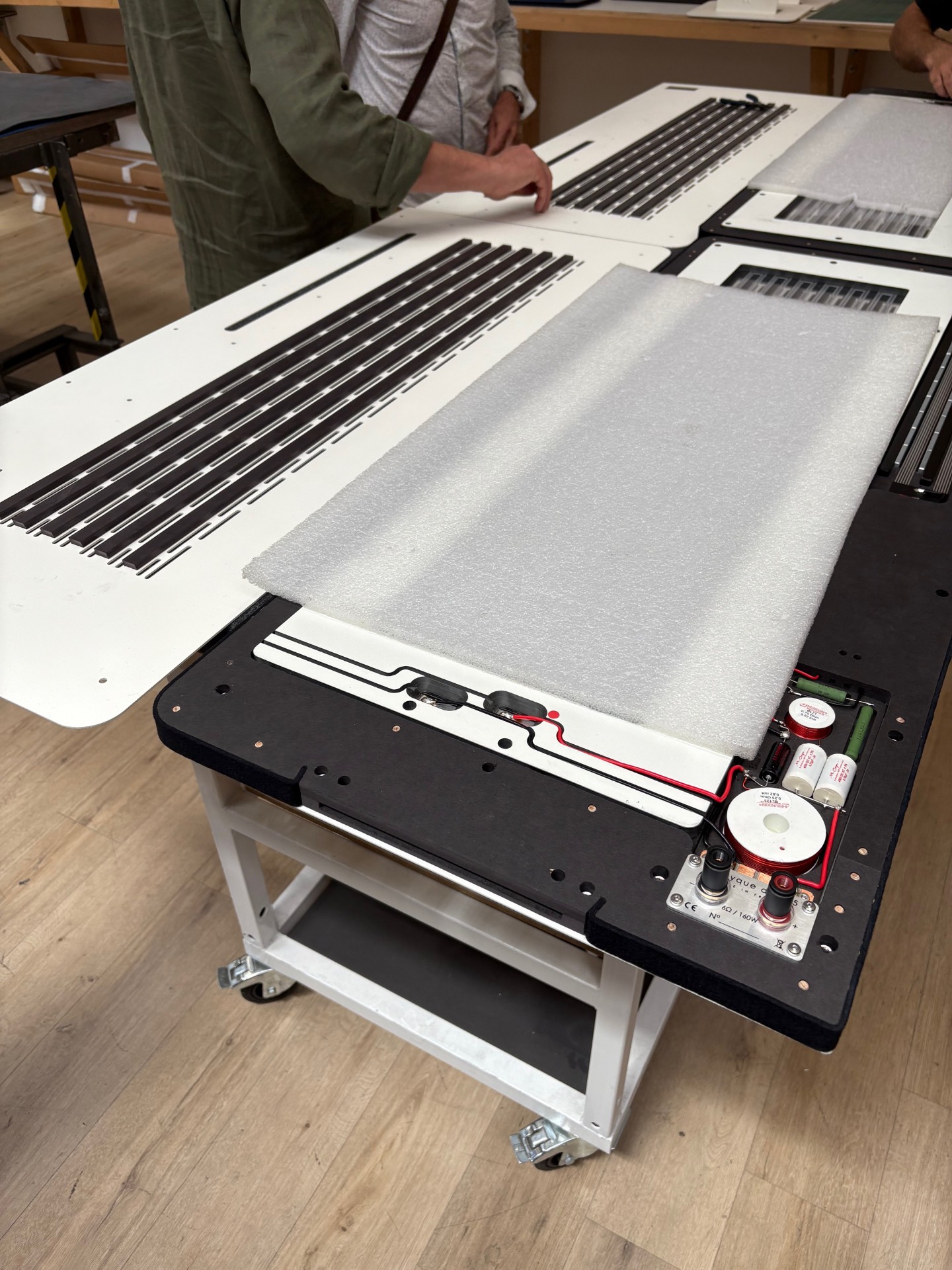 But perhaps the most interesting materials are found in the core panel elements themselves. The diaphragms are tensioned to frames machined from a hard, rigid resin material. Once the thin, transparent plastic diaphragm is evenly tensioned within its frame, the self-adhesive sheet with the voice coil cut into it is carefully applied to it. That complete assembly (diaphragm, frame and voice coil) then drops into a profiled recess machined into a CNCd ‘body’ panel, complete with wiring channels and a cut-out for the crossover. It’s a precision fit that creates a complex constrained layer construction, sandwiched between the metal face plates, with a second resin panel carrying the tweeter diaphragm. It also means that in the rare event of a damaged driver (invariably the result of physical insult – shipping damage or tiny fingers that should know better) a complete panel can be simply and quickly replaced, effectively a sealed unit. Like all isodynamic drivers, the Diptyques are almost indestructible when it comes to electrical abuse. The body panel that accepts the tensioned diaphragm/frame is itself sculpted from a special, locally produced, solid black MDF material. It might be hidden away inside the finished speakers, but it sure makes for funky looking parts!