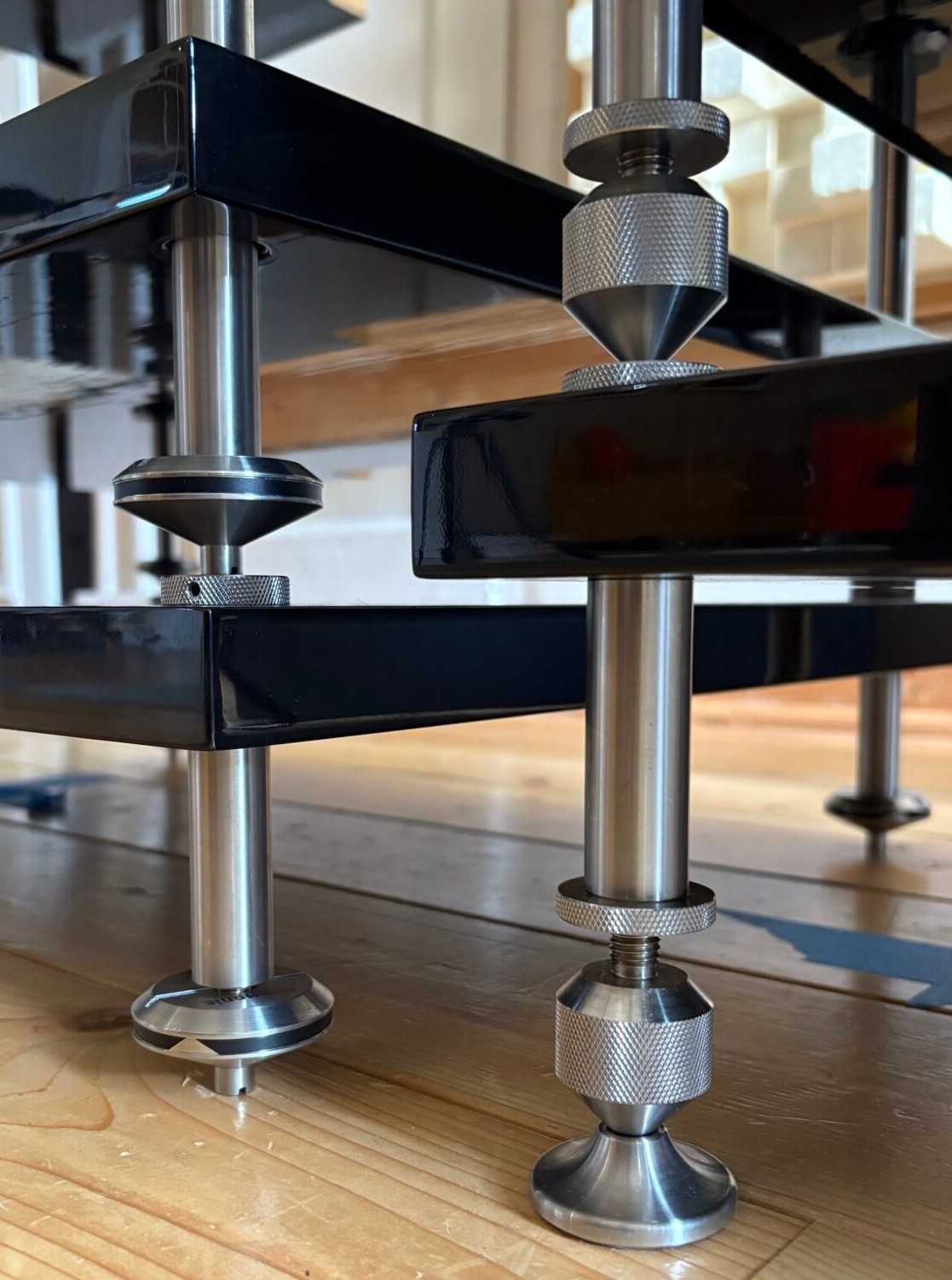 Of course, you need a suitable rack to fit the Harmonies – and I have just the thing. The Blue Horizon Professional Rack System (or PRS) is a classic, modular design based around threaded uprights that screw together, clamping shelves between them. It’s a basic structure that’s been used by everyone from Quadraspire to SolidSteel, but the devil is, as always, in the details and variations on the theme are legion. The PRS ticks a couple of what are, in my experience, important boxes. It uses solid stainless steel uprights with integral threads (rather than threaded studding inserted into their ends) and it uses laminated bamboo shelves, a material that takes a lot of beating in performance terms, unless you are going to get seriously exotic/expensive. Normally it employs solid stainless-steel cones with 10mm threaded posts and lock nuts to facilitate levelling and mechanical grounding. All of which makes it an ideal test bed for the Harmonie. With a set of 10mm adaptors on order, I built two identical racks from my available kit of parts, each consisting of a four-shelf ‘stack’, supported on an independent isolation layer or sub-table. One was fitted with the standard cones beneath both rack and isolation layer, the other with Harmonie footers in the same locations.