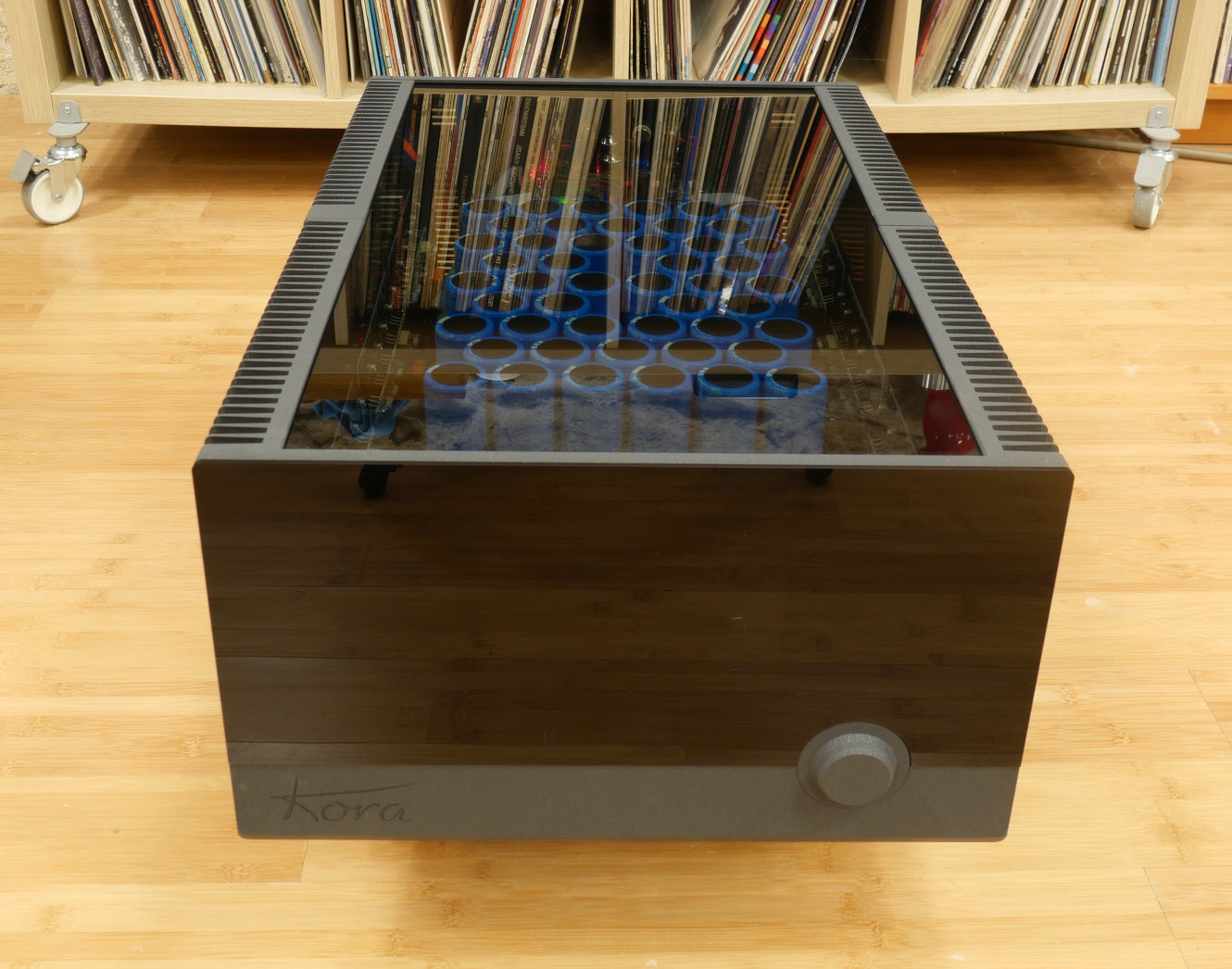 At first glance there’s something distinctly retro about the big Kora amps. The Class A series consists of four models built into two different chassis sizes, each available in stereo or mono versions. The larger amps use the same front panel and side mounted heatsinks as the smaller ones, but are 50% deeper (660 as opposed to 440mm). The range structure is all very original-Krell, the appearance more JRDG Model 3 or 5 – just without the handles. The front-panel is a two-tone design, a tempered glass plate sat above a narrow base strip, painted in the same rather smart grey, textured finish as the main chassis and heat sinks. The large on/off button mimics the volume/control knob on the more affordable units and like them, the CSA-1200 has a (in this case) large illuminated display that indicates the amplifier configuration and status. The rotary knob allows you to navigate the settings in the display., or turn the display off altogether. The top-plate is also smoked, tempered glass, which affords a view of the neatly constructed (and heavily populated) interior. Fit and finish is excellent and these are one set of heatsinks that won’t be ripping up your hands. For such a large amplifier, the end result is surprisingly attractive – much more attractive than it looks in photographs.