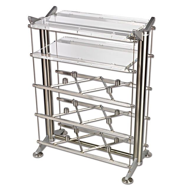 A variation on clamped shelf construction, the supporting surface is held between an upright below the shelf and a top-cap above it, creating support levels that can be stacked on top of another. It offers the same challenges and advantages as fully clamped designs, but its stackable nature certainly adds a degree of installational ease. That covers what might be termed the ‘serious but affordable’ offerings. More expensive racks tend to be variations on the following models: